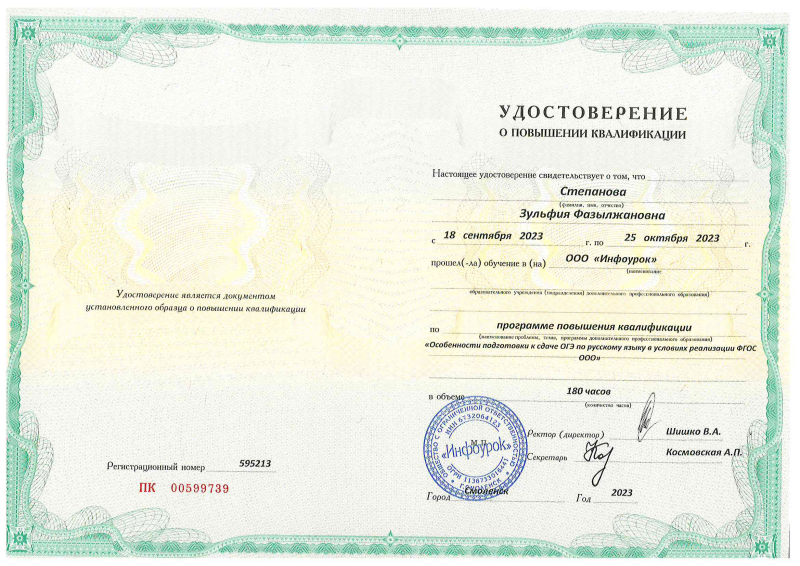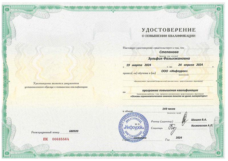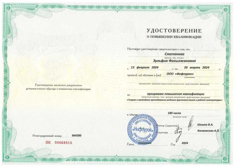 Удостоверение "Теория и Методика преподавания родного языка и родной литературы